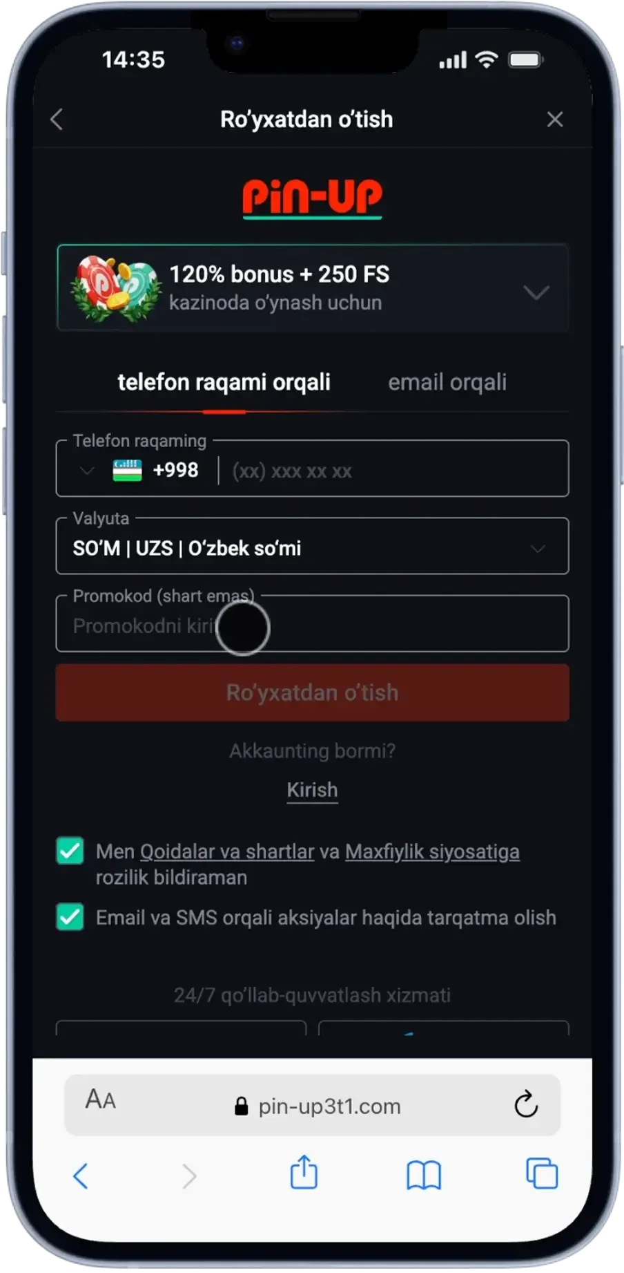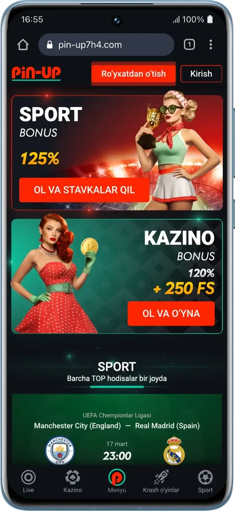 - Android brauzeringizda pinup-uzkirish.com saytiga kiring.