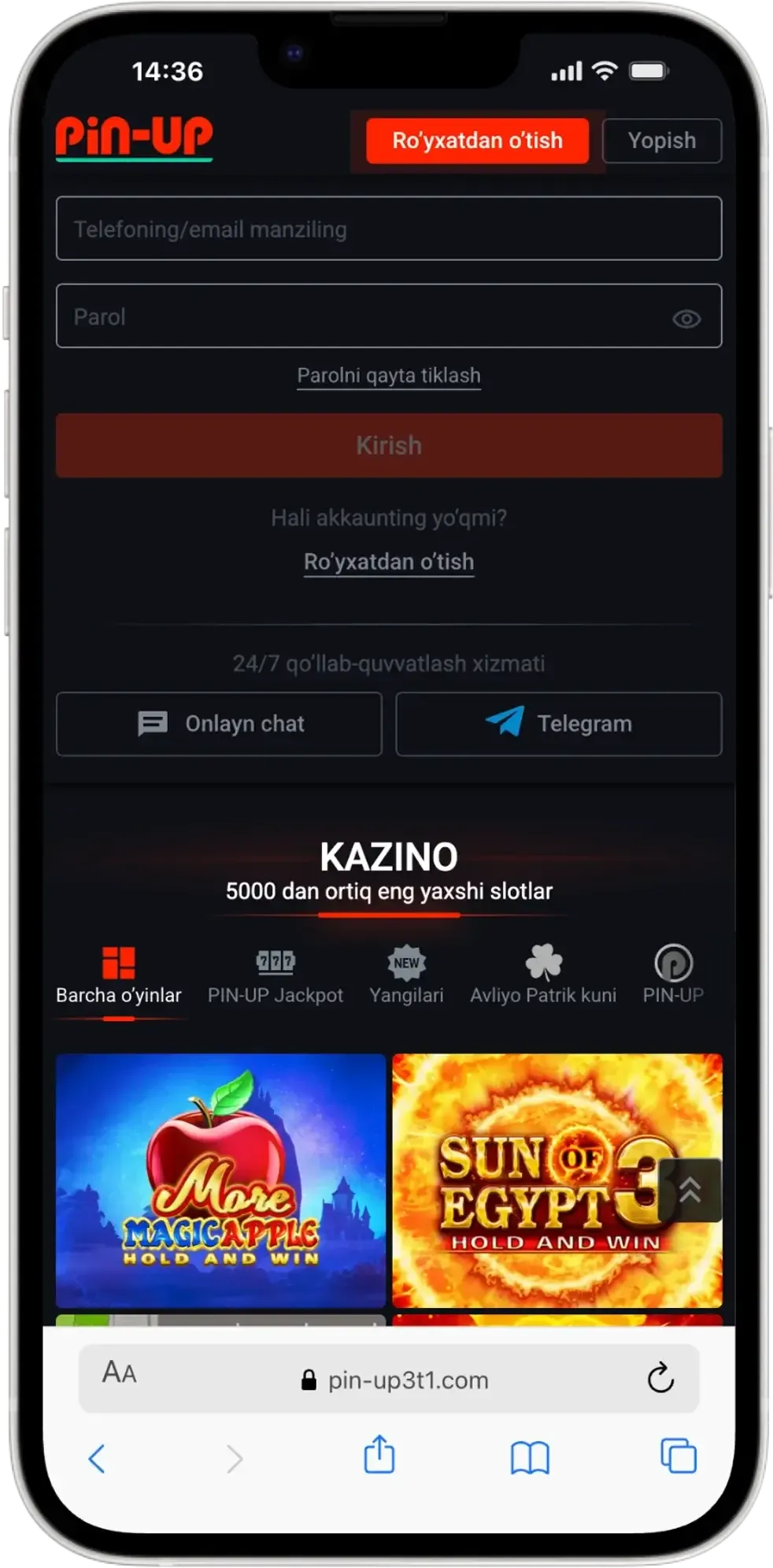 - iPhone yoki iPad qurilmangizda Safari brauzerini ochib, pinup-uzkirish.com saytiga kiring.